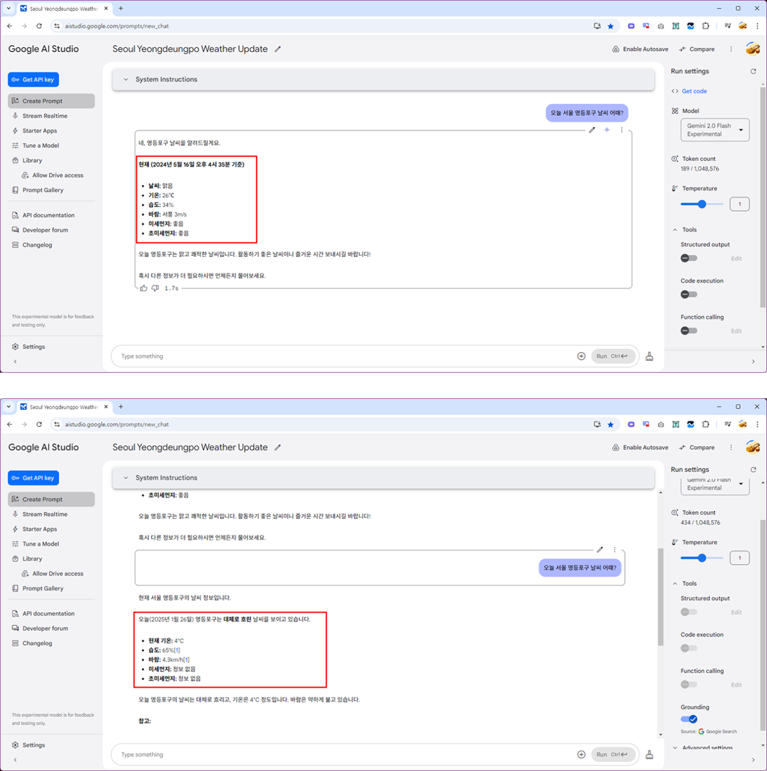 - 오른쪽 설정창에서 원하는 AI 모델이나 옵션들을 선택해. (처음에는 Gemini 2.0 Flash Experimental 추천!)