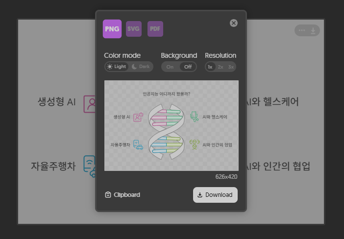 - 완성된 자료는 PNG, PDF, SVG로 저장 가능해서 PPT, 구글 슬라이드, 노션 등 어디서든 사용하기 좋아.