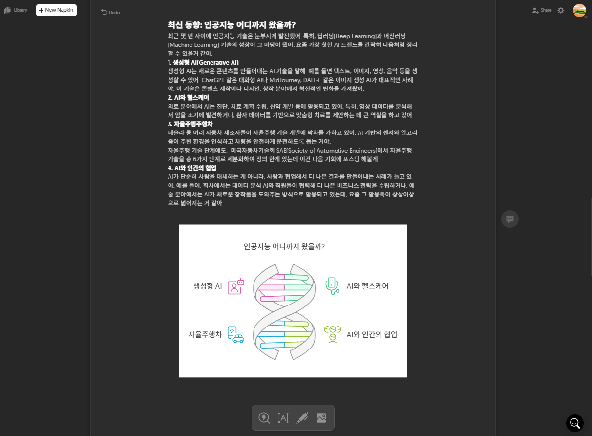 - 이게 Napkin.ai의 핵심 강점 중 하나야. AI가 네 아이디어를 분석해서 패턴을 발견하고, 더 나은 방향으로 발전시킬 인사이트를 제공해. 마치 창의적인 동료 같은 느낌이랄까?