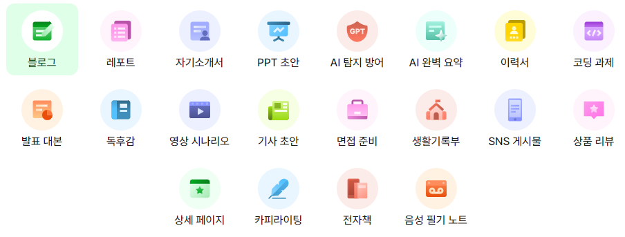 특징: 사용자 요구에 맞춘 다양한 글쓰기 스타일을 제안하고, 문법 및 내용 검토 기능이 뛰어나. 블로거나 SNS 많이 하시는 사람이라면 추천해. (아래 뤼튼에서 제공하는 템플릿? 이야) 최적의 용도: 블로그 포스팅, 기획서 작성, 창의적 글쓰기 등 콘텐츠 제작에 적합해.