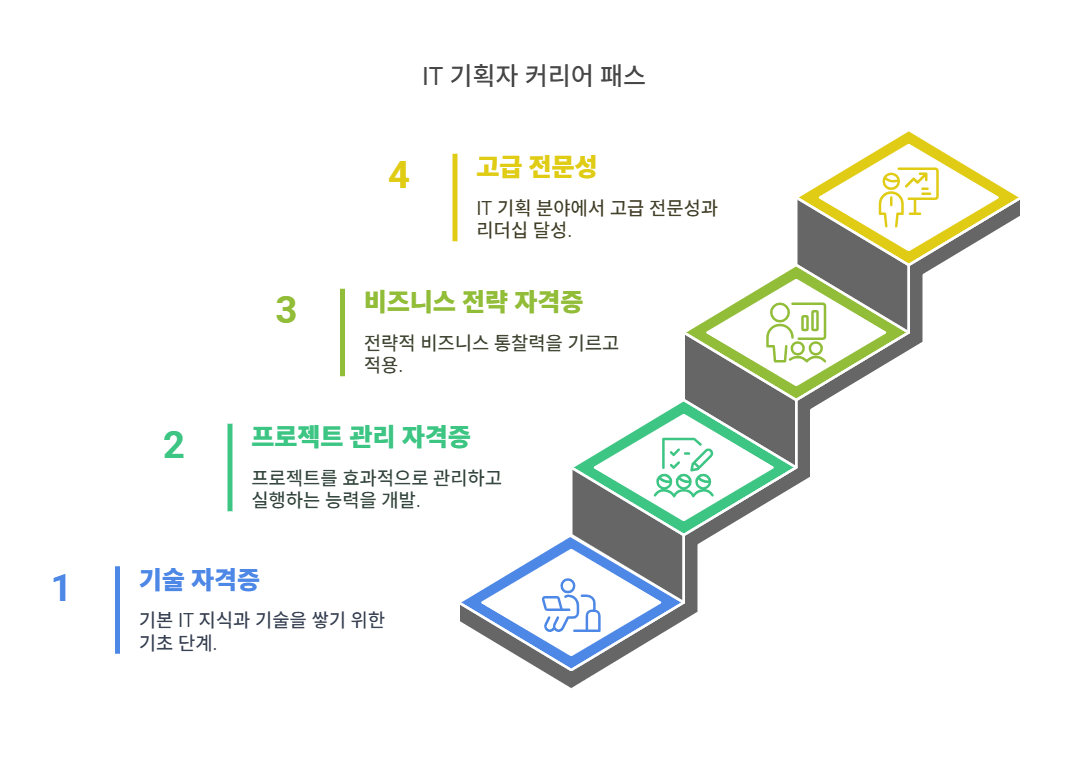 IT 기획자는 커리어 단계에 따라 요구되는 역량이 달라지고, 이에 맞는 자격증을 선택하는 것이 중요해. 신입일 때는 기초적인 IT 지식과 프로젝트 관리 능력을 쌓는 것이 우선이고, 중급 단계에서는 실무 경험을 바탕으로 전문성을 높이고 관리 역량을 키우는 것이 핵심이야. 고급 단계에서는 전략적 사고와 비즈니스 감각을 키워서 기업의 IT 방향성을 결정하는 역할까지 맡을 수 있어야 해.
