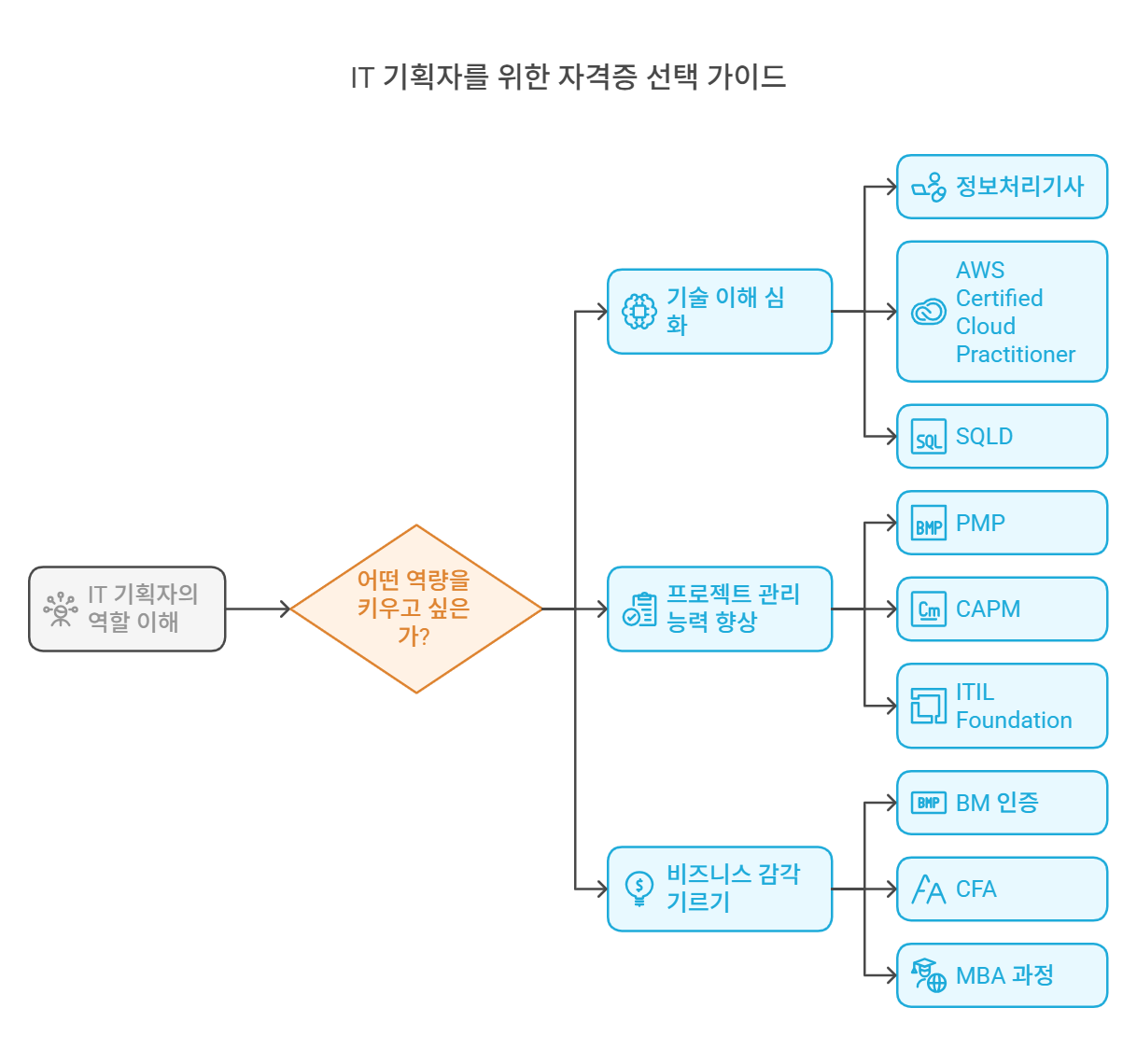 IT 기획자는 단순히 문서 작업을 하는 사람이 아니야. 기술 + 기획 + 비즈니스 감각까지 두루 갖춰야 하는 역할이야. 그렇기 때문에 어떤 커리어를 목표로 하느냐에 따라 필요한 자격증이 달라질 거야.