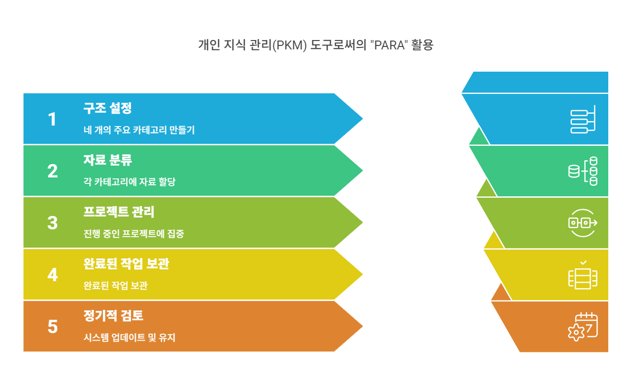 한 달에 한 번씩 PARA 폴더를 점검하면서 불필요한 자료를 정리하면 더 깔끔하게 유지할 수 있어.