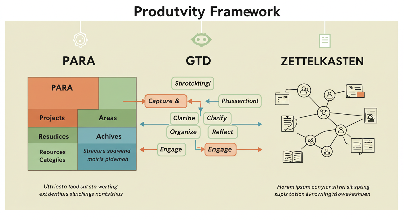 그래서 등장한 게 바로 "생산성 시스템"이야. 그중에서도 "PARA, GTD(Getting Things Done), Zettelkasten"은 현대 지식 근로자들이 널리 사용하는 강력한 정보 관리 방법론으로 주목받고 있어.