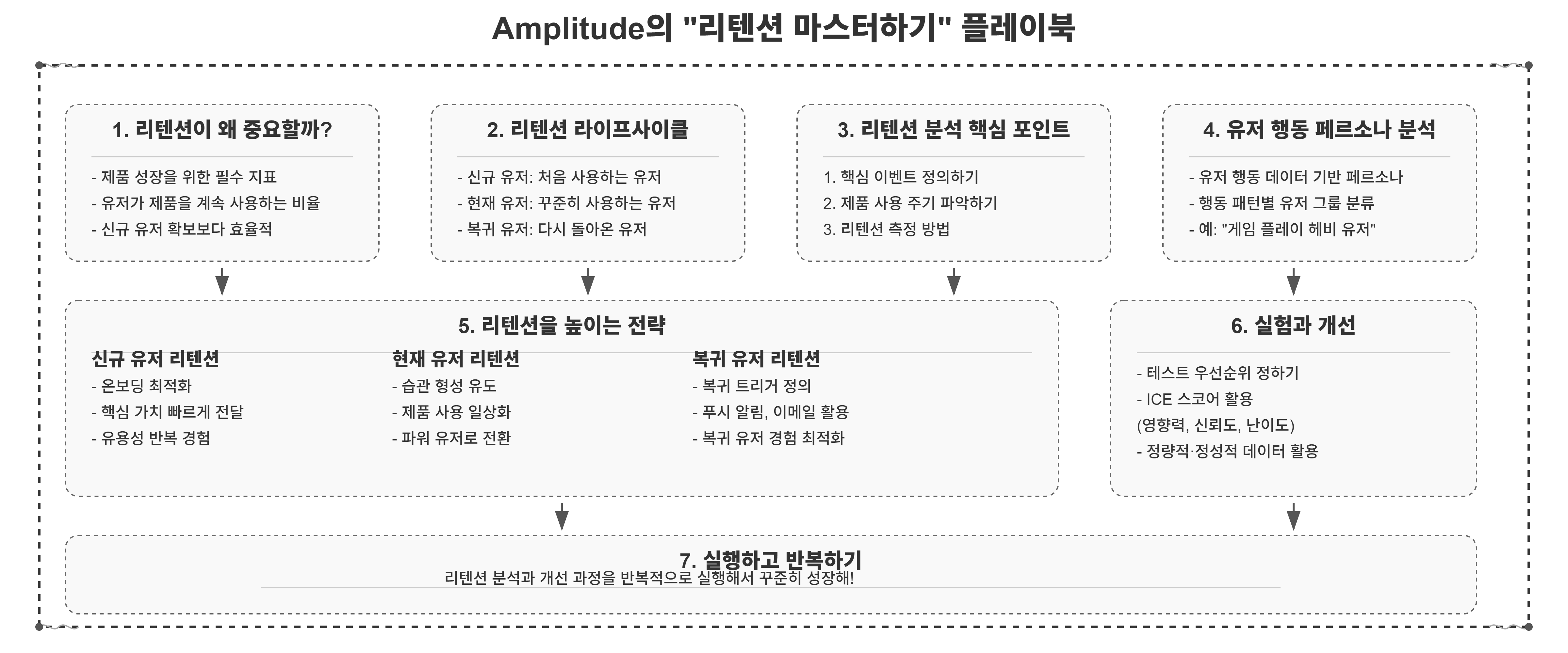 Amplitude의 "리텐션 마스터하기" 플레이북은 유저 리텐션을 이해하고 개선하는 데 필요한 전략과 프레임워크를 알려주는 자료야. 이 플레이북은 유저 행동 데이터를 기반으로 리텐션을 분석하고, 제품의 장기적인 성장을 도와주는 방법을 다뤄. 주요 내용은 아래와 같아.
