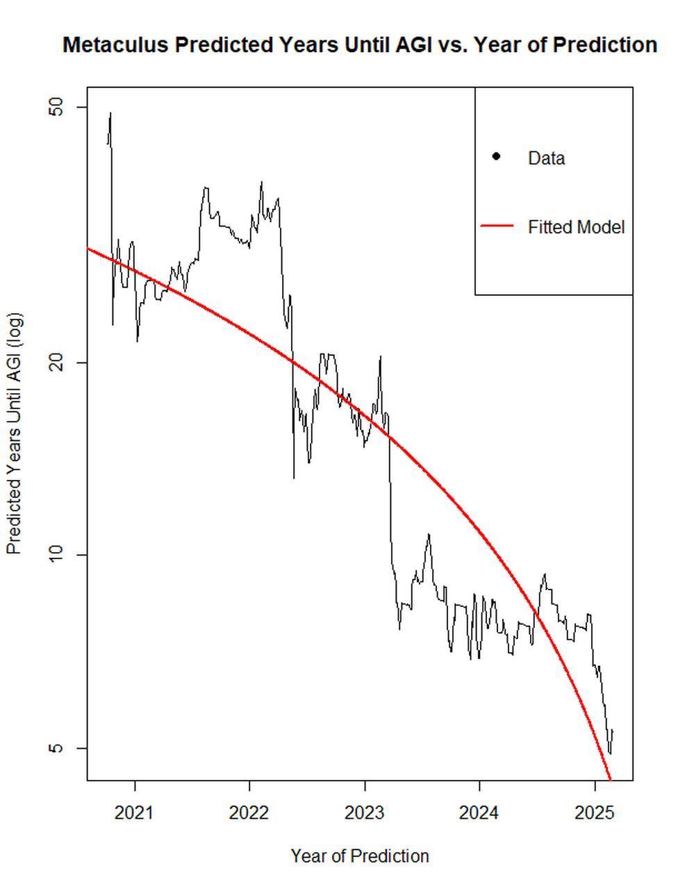 이 그래프는 2021년부터 2025년 사이의 예측을 기반으로 하며, AGI까지 도달하는 데까지의 시간을 보여줘.