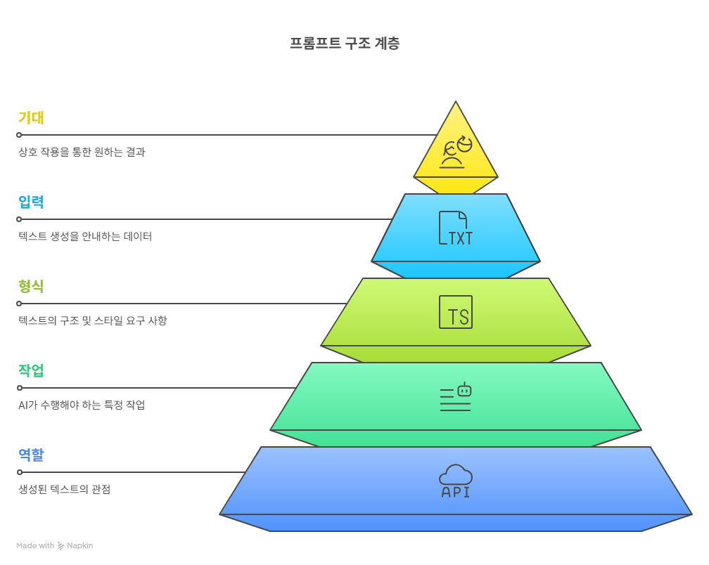 - 역할(Role): 생성된 텍스트가 작성되어야 하는 관점을 지정. (AI가 응답할 때 구현해야 하는 개체 또는 페르소나를 정의)