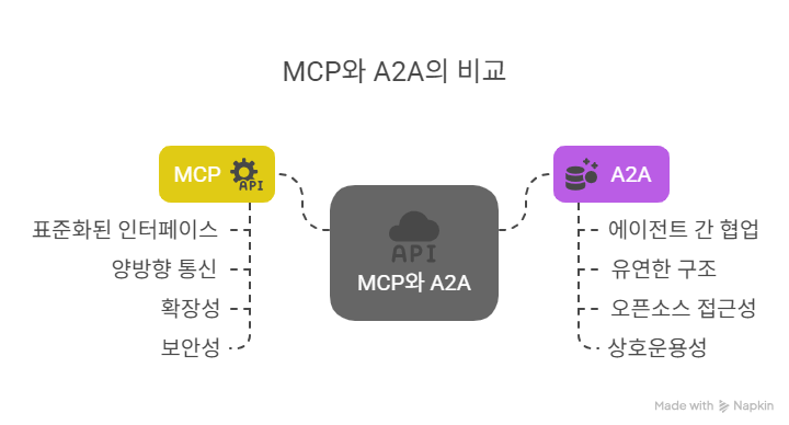 | 주요 목적 | AI 에이전트와 외부 도구/데이터 소스 간 연결 | AI 에이전트 간 직접 통신 및 협업 |