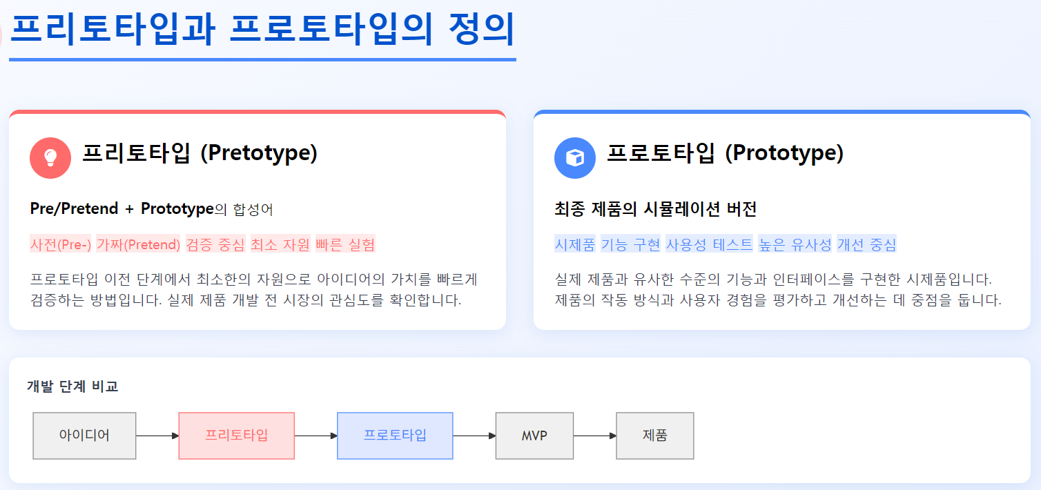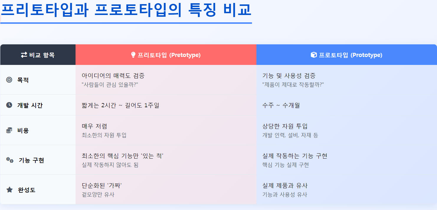 프리토타입과 프로토타입은 기본적인 개념은 비슷하지만, 실제로 진행되는 과정과 목적은 달라. 프리토타입은 아이디어가 실행 가능한지를 판단하는 과정이라면, 프로토타입은 실제 제품이 어떻게 구현될지를 테스트하는 단계야.