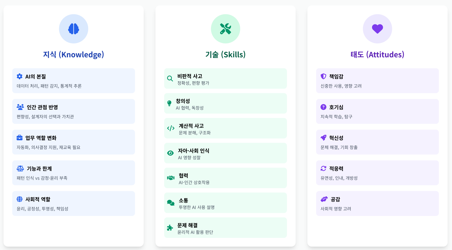 - 기술 (Skills): 기본적인 인간 능력이 AI 맥락에서 적용되는 방식을 보여주며, 학습자가 AI를 윤리적으로 사용하도록 안내합니다.